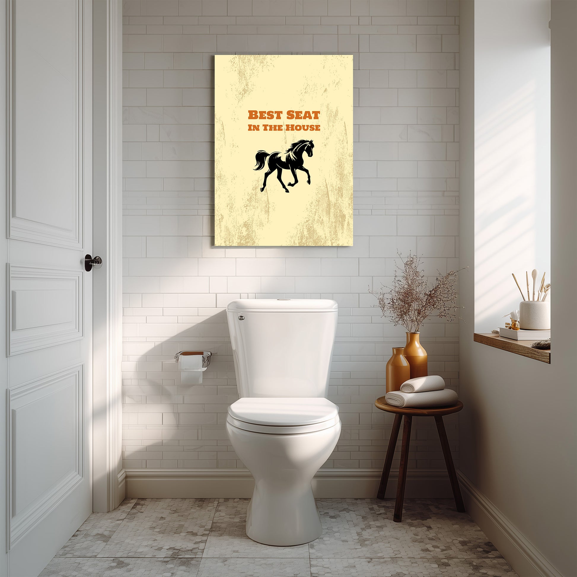 A fun western-themed canvas - perfect for adding a touch of humor to your bathroom decor. Ideal for those who enjoy lighthearted and whimsical decorations for their home.